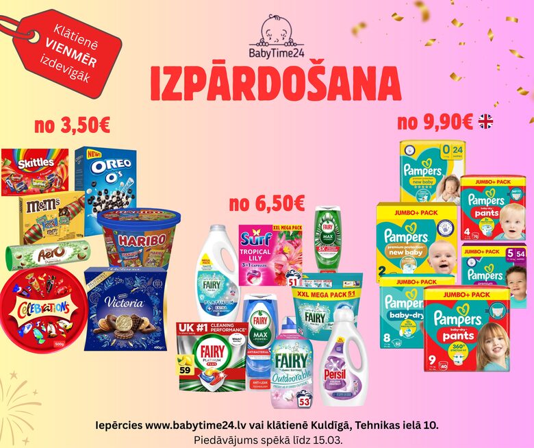 Pie mums iespējams iegādāties arī UK ražotus mazgāšanas līdzekļus, saldumus un apģērbu bērniem.